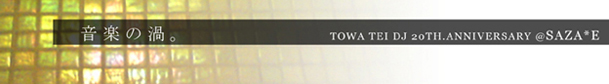とにもかくにも、梅田SAZA*Eで行われたTowa tei DJ 20th.Anniversary tour in osakaは、予想以上の熱気と湿気で、フロアに響く音楽と、それに乗せてそれぞれのリズムを刻む観衆たちは、恍惚エクスタシーの塊だった。空調も間に合わない程の熱気は、テイトウワその人が回す音に比例して上昇し、6月2日のSAZA*Eは、まさにサザエの壺焼き状態だった。