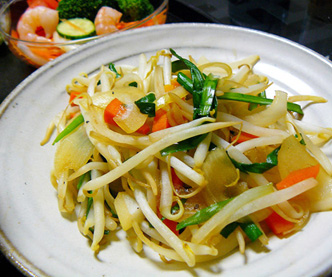 もやし炒めは、塩コショウと醤油で味付け。だしの素も少し入れたかな。