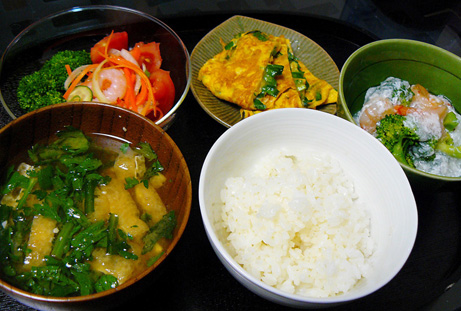お味噌汁の具は、春菊とお揚げさん。春菊がたまらんのだよ。