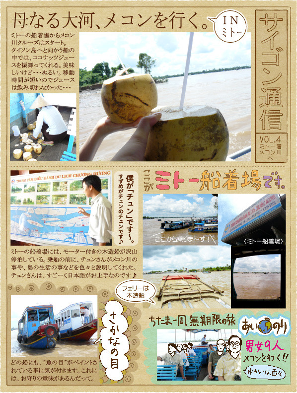 そんな愉快な一行を乗せたワゴンはホーチミンから2時間の移動を終え、雄大なメコン川が流れるミトー市へ到着し、『チュンさん』引率のもと、男女9人はメコン川クルーズの出発点のフェリー船着場へと向かったのだった。