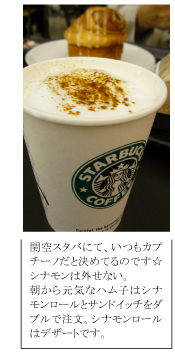 キャセイのカウンターでは、「税関混んできますので、なるべく早く通って下さい。」という親切なGHの声にも耳を傾けず、いい意味でも悪い意味でも鈍感な私たちは、税関を通る前に腹ごしらえをしようと、スタバにてマターリしていた。